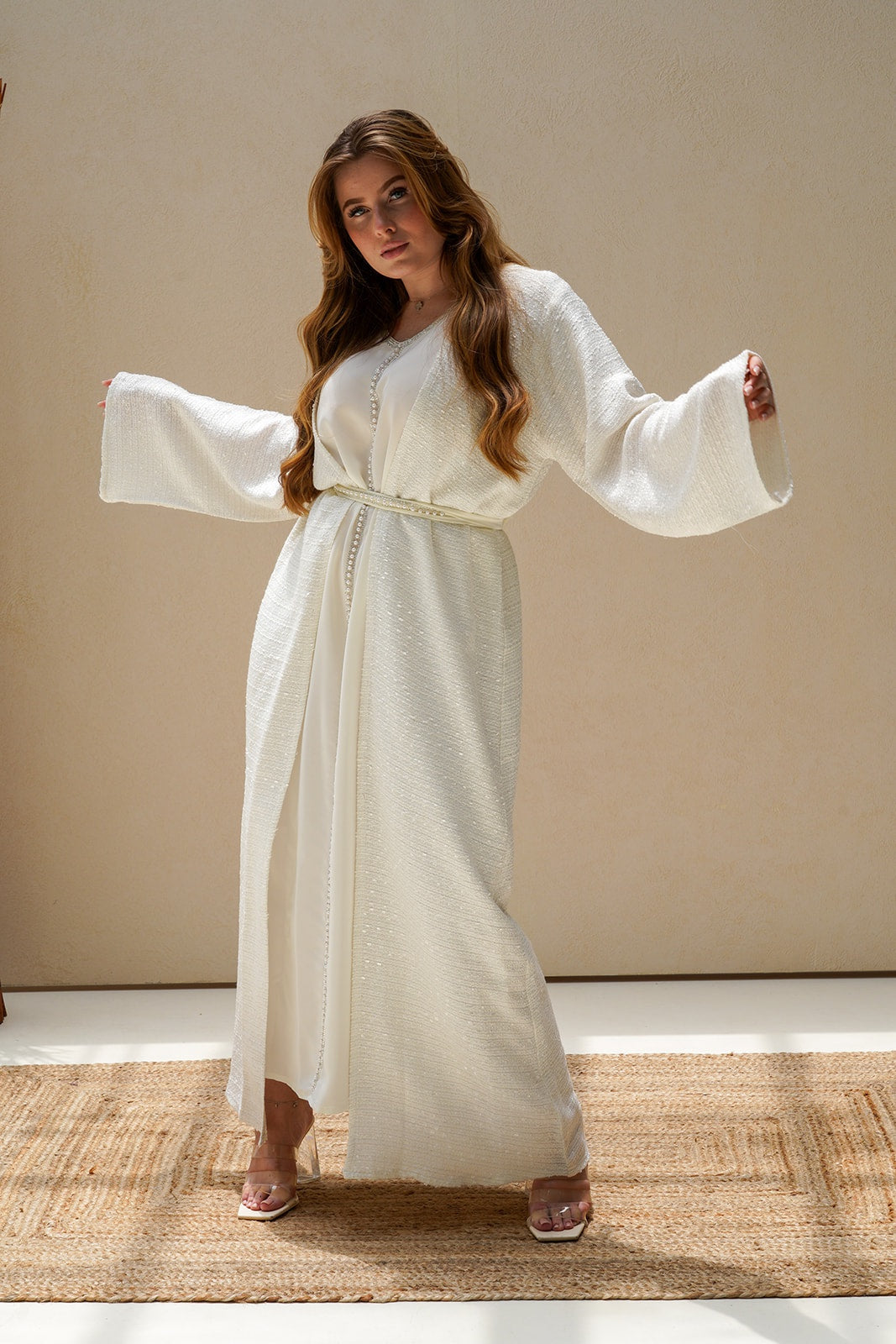Accompagné d’un kimono en laine d’été légère, ce duo se pare d’un blanc cassé lumineux, symbole de pureté et de sophistication. L’alliance subtile de ces matières nobles offre un équilibre parfait entre style et confort.