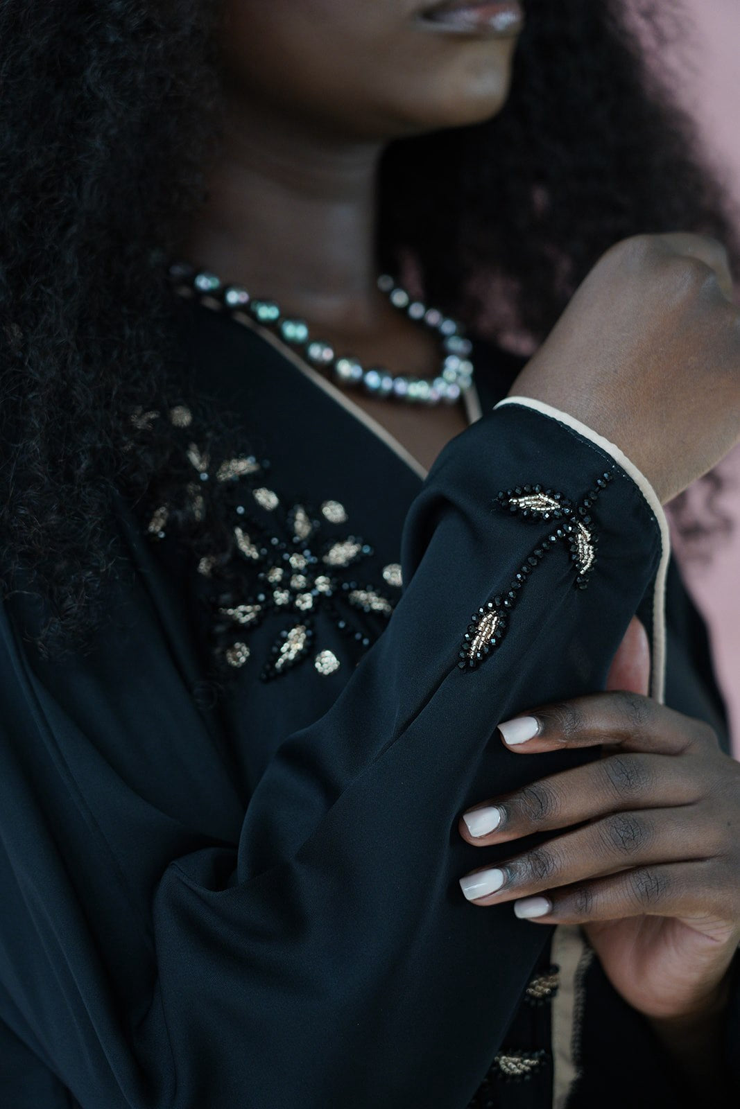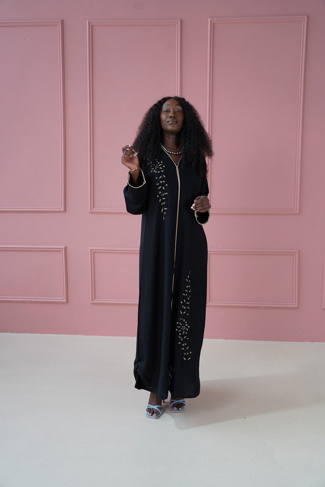 Cette abaya noire incarne la sophistication pure, avec une coupe fluide qui flatte la silhouette tout en offrant un confort exceptionnel. Le noir profond de l'abaya offre une toile de fond parfaite pour les détails précieux qui ornent la pièce.