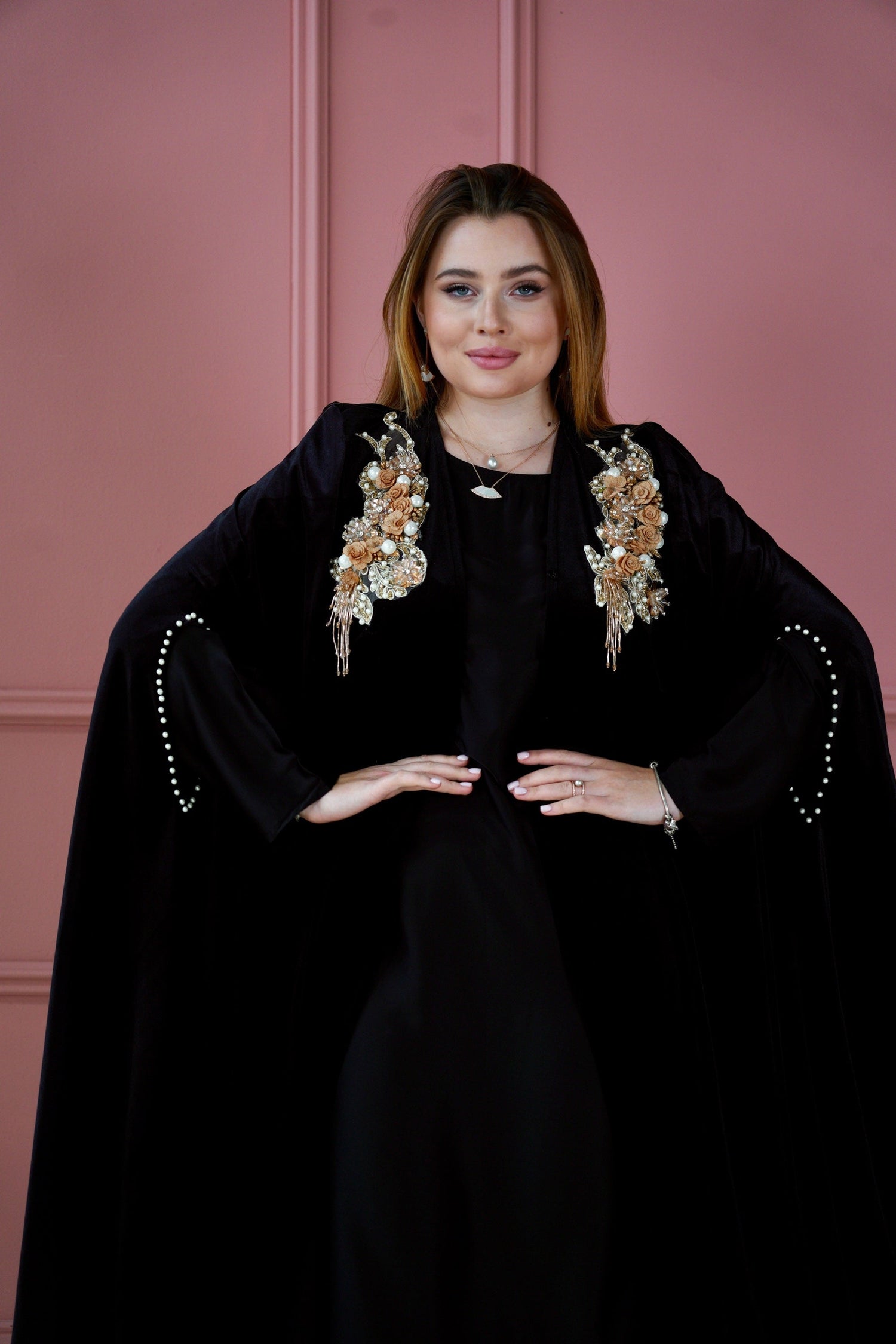 Velours Enchanté, pièce phare de notre collection, séduit par son allure majestueuse et son design sophistiqué. Cette cape abaya de luxe en velours noir somptueux est ornée de perles délicates et de fleurs en cuir au buste, alliant féminité et caractère.